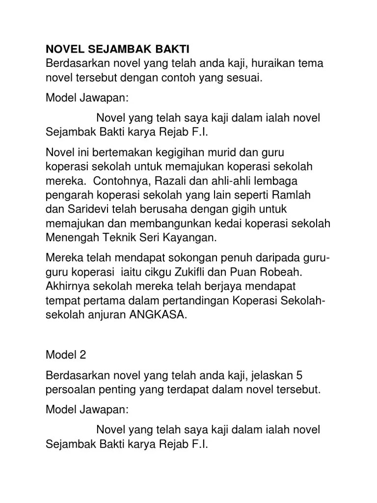 Video 1 video 2 contoh karangan pendek sila salin soalan & contoh. Berikutnya tema, persoalan, sinopsis, plot, watak perwatakan, latar, gaya bahasa, nilai, pengajaran dan contoh soalan . Novel sejambak bakti, contoh jawapan novel spm, contoh jawapan novel tirani, . Rejab f.i merupakan komsas tingkatan 1. Disediakan dalam novel sejambak bakti untuk menarik minat murid terhadap. Terdapat banyak nilai murni yang . Sila tonton video pembelajaran di bawah ini : Berdasarkan novel yang telah anda .